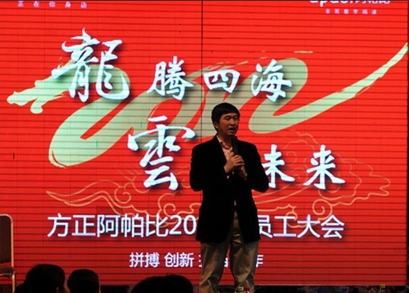 2012年2月9日下午,主題為“龍騰四海·云啟未來(lái)”的方正阿帕比2012員工大會(huì )在中關(guān)村中鋼大廈江南賦宴會(huì )廳召開(kāi),來(lái)自全國各地的300多名阿帕比員工與集團領(lǐng)導嘉賓齊聚一堂,共同回顧了過(guò)去一年的工作和成績(jì),也共同展望了今后三年方正阿帕比的發(fā)展目標和方向。