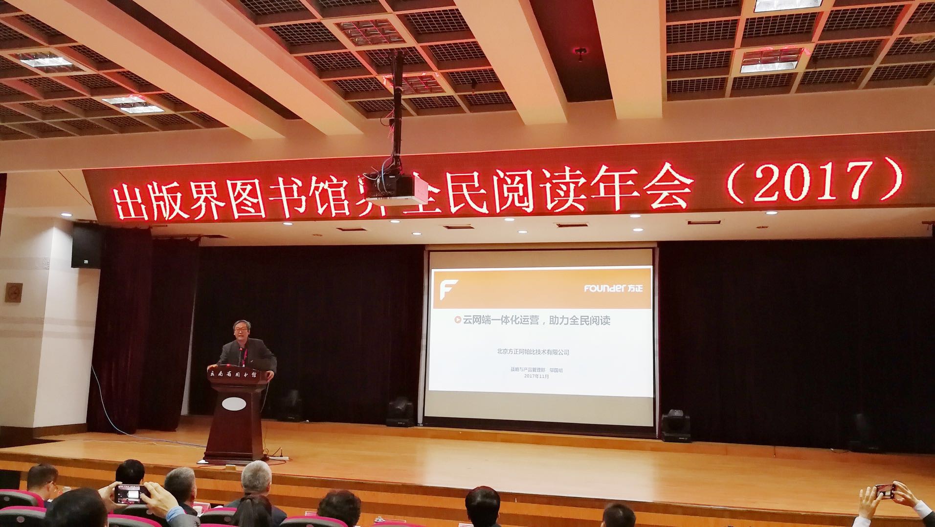 云南省文化廳紀檢組長(cháng)邱旗,中國圖書(shū)館學(xué)會(huì )副理事長(cháng)劉小琴,中國出版集團公司副總裁姜軍,韜奮基金會(huì )副理事長(cháng)兼秘書(shū)長(cháng)左曉光,以及新華萬(wàn)維國際文化傳媒(北京)有限公司常務(wù)副總經(jīng)理高德明出席了會(huì )議并發(fā)表了致辭。此次,北京方正阿帕比技術(shù)有限公司副總經(jīng)理龍新宇、產(chǎn)品與戰略委員會(huì )總經(jīng)理鄔國明及相關(guān)同事共同參加會(huì )議。
