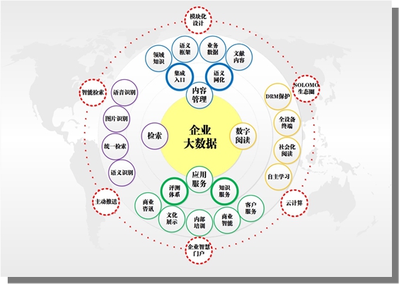 方正阿帕比提出的智慧企業(yè)概念是一種圍繞企業(yè)大數據進(jìn)行的知識管理與服務(wù)的解決方案,它打破了傳統互聯(lián)網(wǎng)以信息形式管理文獻的方式方法,而是圍繞企業(yè)業(yè)務(wù)和培訓需要,進(jìn)行企業(yè)知識的內容管理、知識檢索、閱讀與其它智能化的應用服務(wù),該解決方案全程對內容進(jìn)行語(yǔ)義化,從而使企業(yè)完成從信息化到智能化的升級轉變。